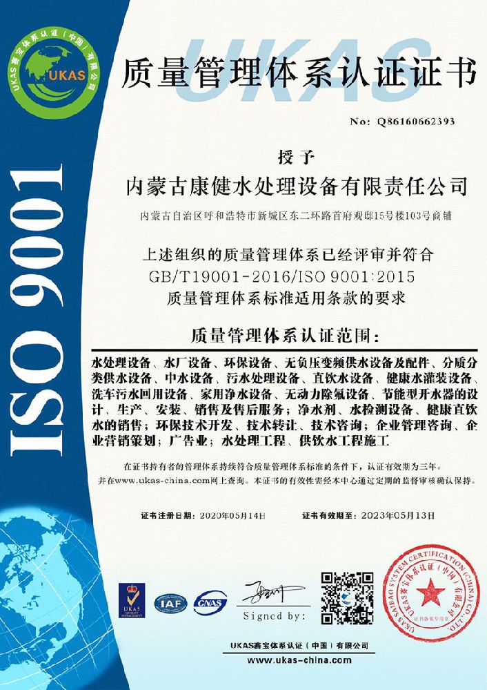 - 內(nèi)蒙古康健水處理設(shè)備有限責(zé)任公司是專業(yè)生產(chǎn)制造水處理設(shè)備、飲料設(shè)備、奶設(shè)備、殺菌設(shè)備、灌裝設(shè)備五大系列90余種配套產(chǎn)品。在反滲透、超濾、納濾、EDI模塊、等膜分離領(lǐng)域有著雄厚的技術(shù)實(shí)力,同時(shí)在水廠設(shè)計(jì)、中水回用、污水處理、分質(zhì)供水、無(wú)負(fù)壓變頻供水、鍋爐軟化水設(shè)備等領(lǐng)域有完善的技術(shù)團(tuán)隊(duì)和營(yíng)銷網(wǎng)絡(luò)。公司坐落在遼闊大草原上美麗的首府——呼和浩特,是內(nèi)蒙古自治區(qū)唯一一家具有自主生產(chǎn)能力的企業(yè)。 “上善若水,水利萬(wàn)物而不爭(zhēng)”康健水工自成立以來(lái),始終堅(jiān)持“改善水質(zhì)、造福人類、服務(wù)社會(huì)、產(chǎn)業(yè)報(bào)國(guó)”的企業(yè)信條,以致力于開創(chuàng)人類綠色健康生活為己任,秉承“關(guān)愛生命、責(zé)任至上”的企業(yè)宗旨,成就了享譽(yù)四方的國(guó)內(nèi)知名水處理企業(yè)。 水是生命的源泉、工業(yè)的血液、城市的命脈。水是不可替代的寶貴資源。節(jié)約用水,關(guān)注點(diǎn)滴 為節(jié)約水資源貢獻(xiàn)一份力量, 健康飲水,利在當(dāng)代,功在千秋! 只有在這里,才能領(lǐng)會(huì)水的精髓;只有在這里,才...